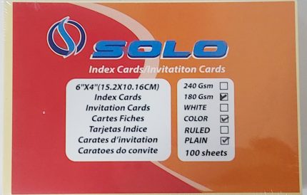 Brand: SOLO Color: White Size: 15.2 cm X 10.16 cm Paper Thickness: 180 GSM Packet Qty: 100 pcs Ruling: Plain